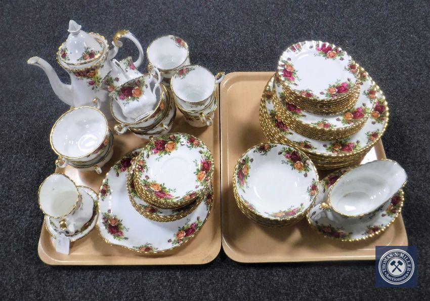 Two trays containing sixty-two pieces of Royal Albert Old Country Roses tea and dinner ware