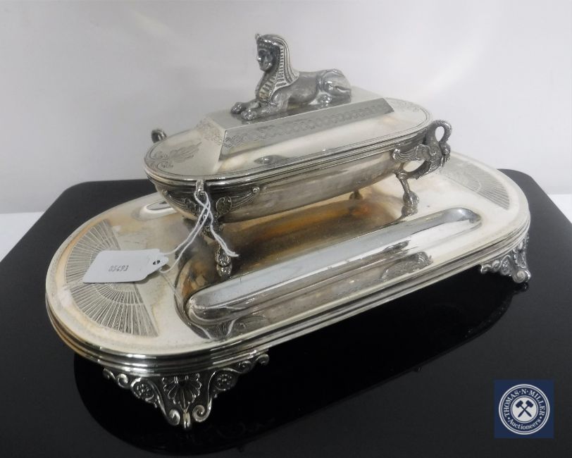 An Egyptian Revival silver plated desk standish by Henry Wilkinson & Co.