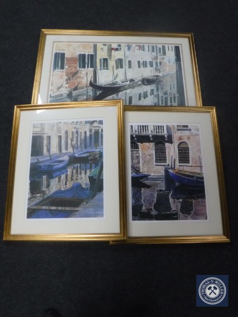 Three gilt framed M. M. Wood signed prints, Venice Reflected, Corte Vechia and Zephyr