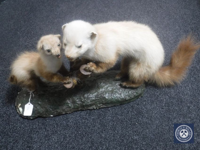 A taxidermy group of two stoats on a branch