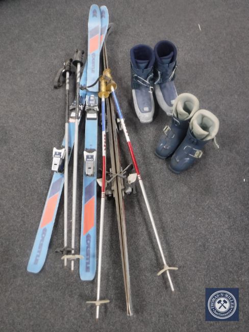 A pair of Atomic skis, pair of Castle skis, two sets of ski poles and two pairs of ski boots