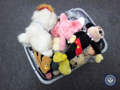 A box containing mid 20th century and later soft toys and dolls