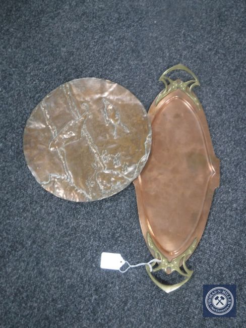 An Art Nouveau copper and brass tray and a circular copper plaque
