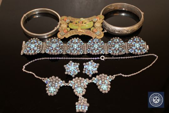 Two silver bangles together with an Egyptian revival brooch, a suite of continental white metal and enamelled jewellery.