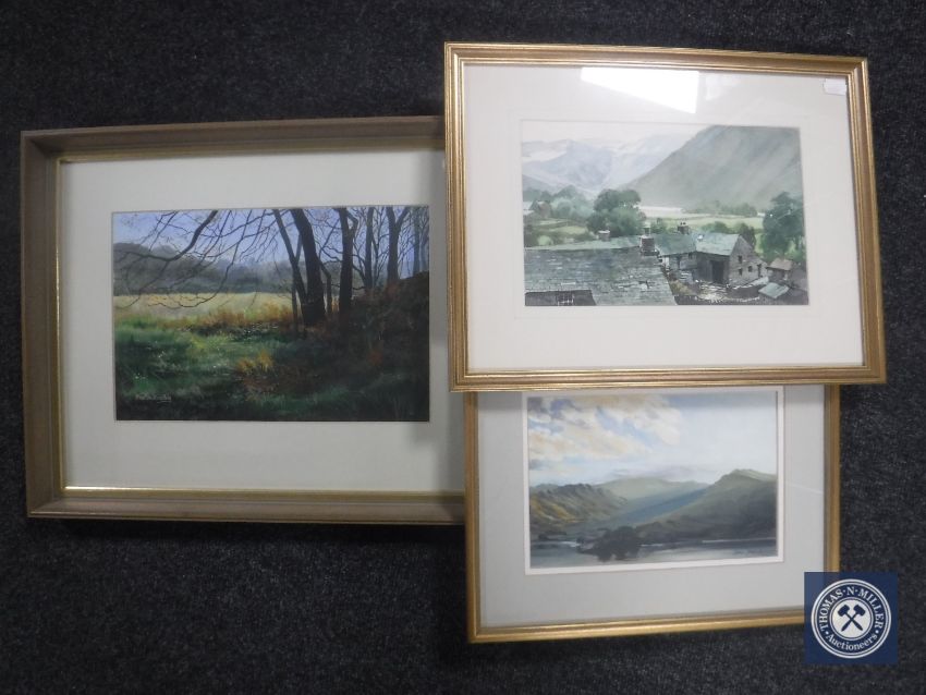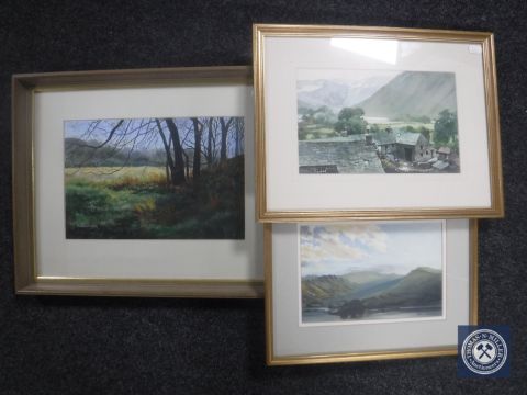 Three framed pictures : Marion Bradley watercolour, George Busby watercolour, Jim Ridout watercolour, Evening Shadows