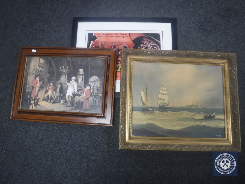 A reproduction framed Al Capone movie poster, gilt framed oil of boats at sea and a print