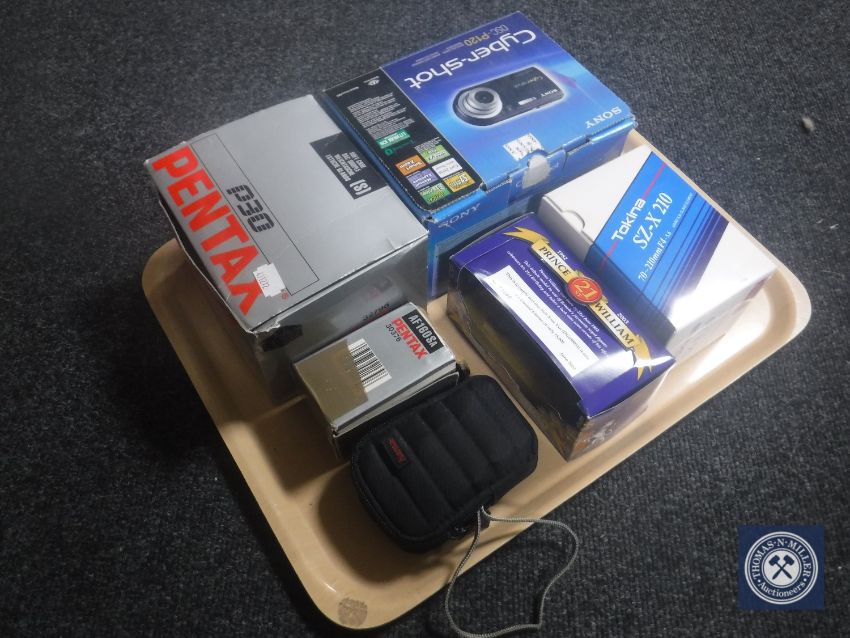 A tray of Pentax P30 camera with lens, Sony Cyber Shot digital camera, etc