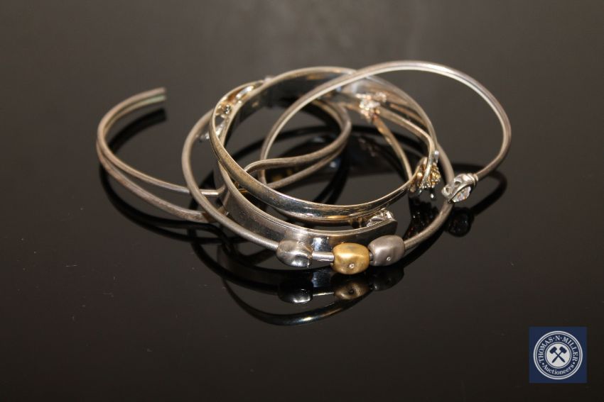 Three sterling silver and two white metal bangles (5)
