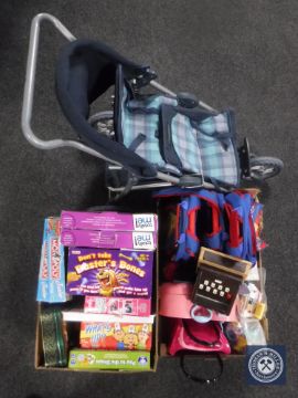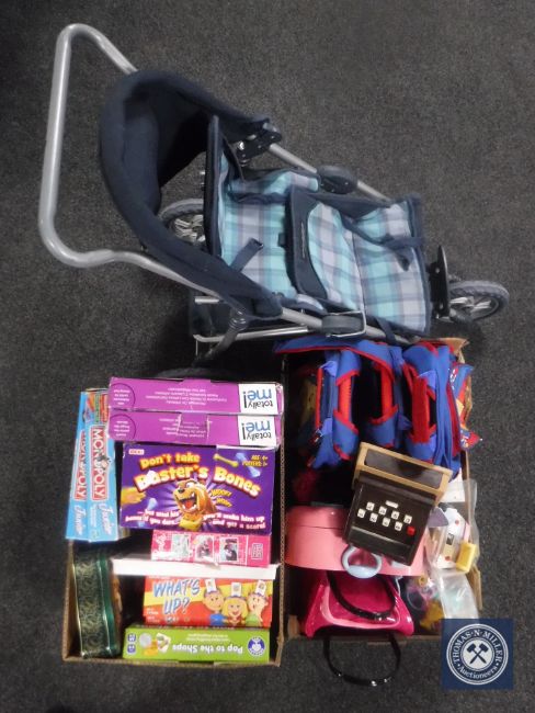 Two boxes containing children's toys, board games, together with a Mamas and Papas doll's push chair
