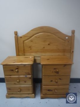 A pair of pine three drawer bedside chests and 3' pine headboard