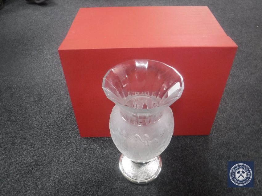 An impressive Ottoviani crystal vase, decorated with panels of Grecian figures, mounted on white metal plinth base, with extensive retail box.