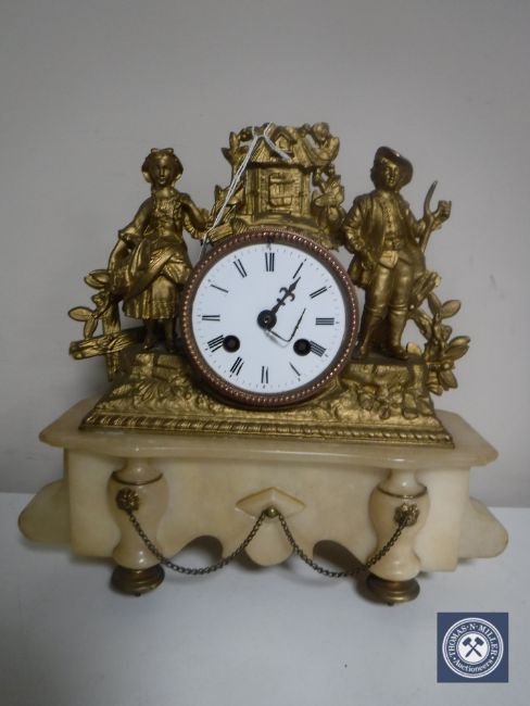 A continental alabaster and gilt metal mantel clock with enamelled dial