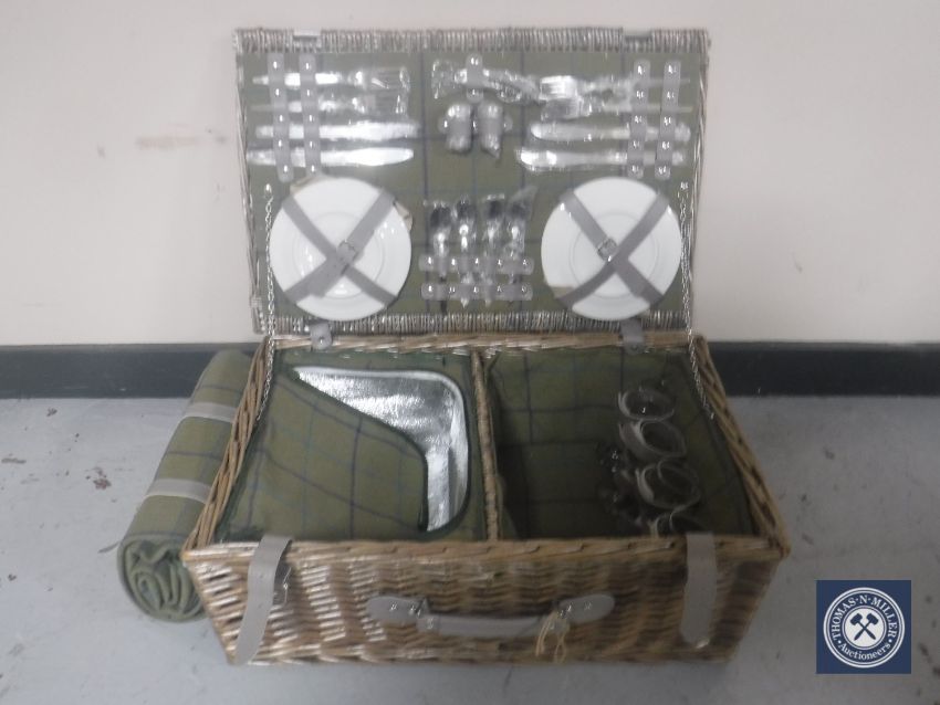 A wicker picnic basket with travel rug