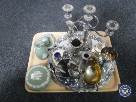 A tray of assorted plated wares including serving tray, candelabra, sugar helmet, together with four pieces of green Wedgwood Jasperware