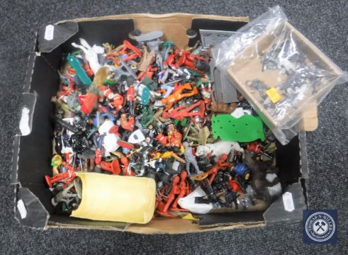 A box containing mid 20th century and later plastic soldiers including Timpo toys, Britains