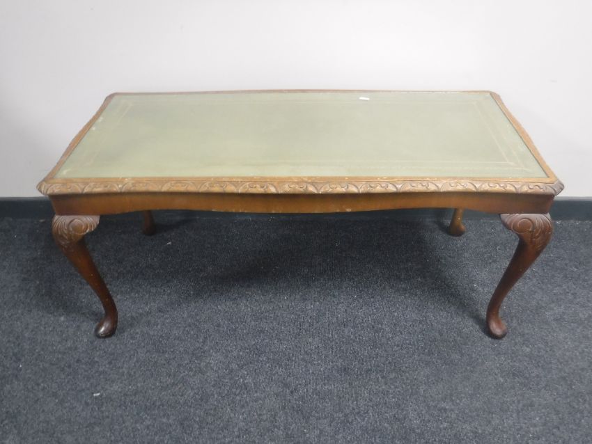 A mahogany leather topped coffee table and nest of tables