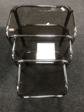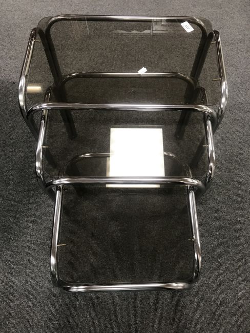 A 20th century tubular metal dining table base with oval smoked glass top, six tubular metal and leather armchairs together with a matching nest of three tables