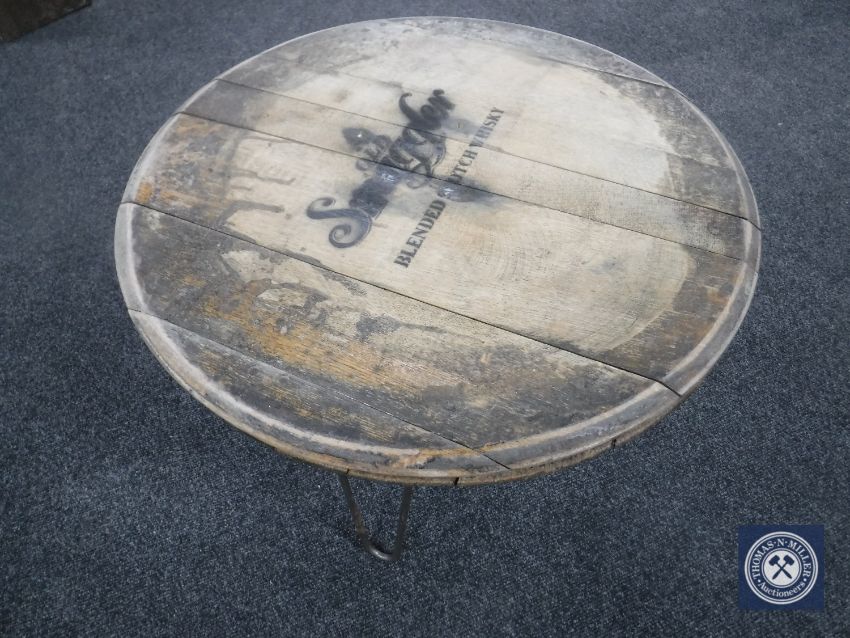 An oak barrel-topped coffee table with Old Smuggler Scotch Whisky advertising