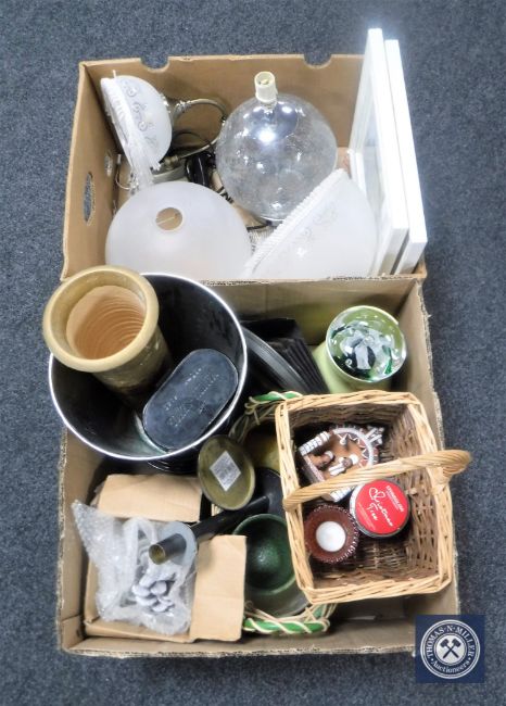 Two boxes of contemporary light fittings, table lamp, glass shades, pictures of Paris, wicker basket, wine cooler, candle holders etc