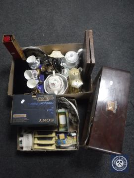 Two boxes of assorted china, cased cutlery, camera, mantel clock, die cast vehicles, together with an HMV walnut cased valve radio