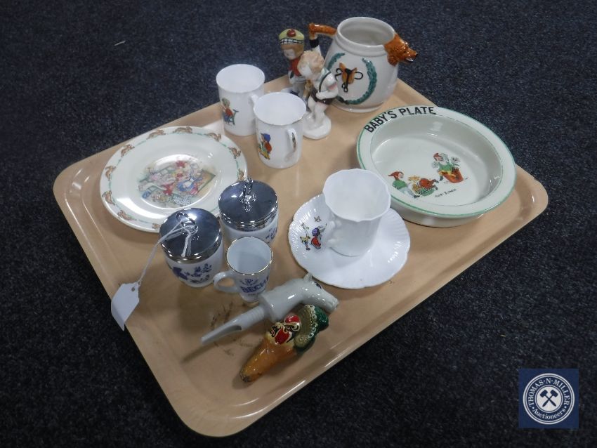 A tray containing vintage baby plate, part child's china tea service, Royal Doulton Bunnykins plate, Royal Worcester egg coddlers, bottle stoppers, figures etc
