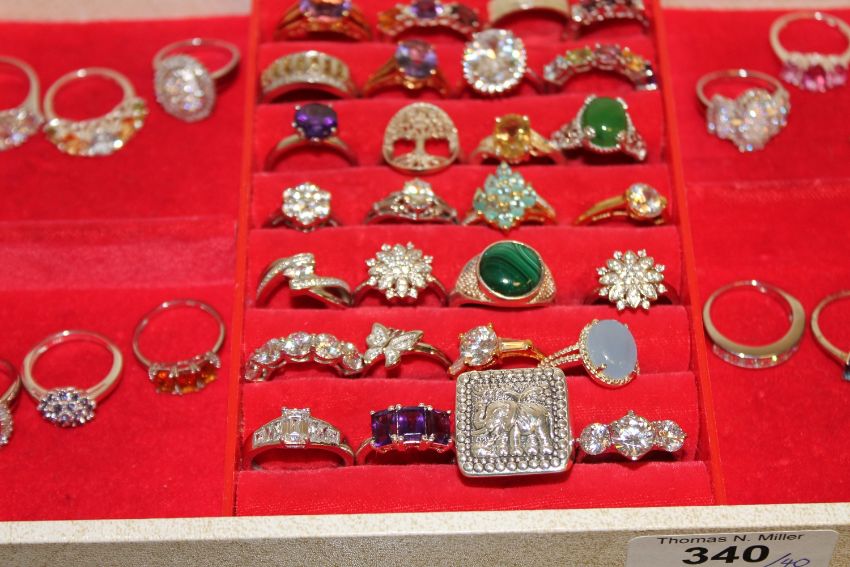 A collection of forty silver dress rings, variously set with amethysts, malachite, cubic zirconia, citrine, topaz etc (40)