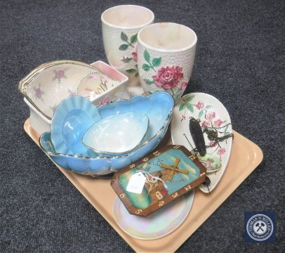 A tray of mid 20th century wooden cuckoo clock, Maling lustre china and five further lustre dishes