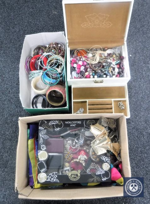 A box of jewellery box, quantity of costume jewellery including bangles, necklaces, scarves etc