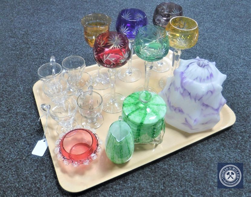A tray of coloured hock glasses, cranberry glass bowl, green glass sugar basin and jug, Art Deco marbled glass light shade etc
