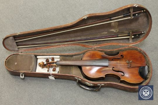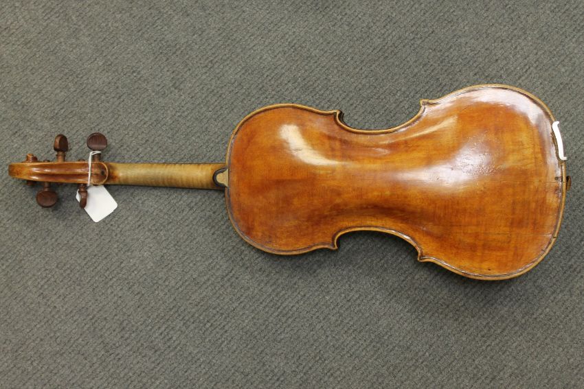 An antique violin, probably nineteenth century, two-piece back construction, length 13.75", bearing a label indistinctly marked 'Jacobus Stainer..', with two later bows, cased.