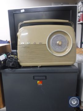 A JVC 17 inch LCD TV with remote, a Bush radio and a metal lock box