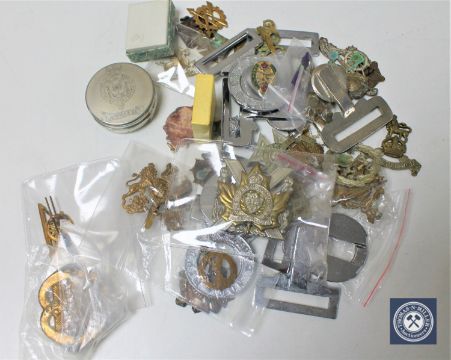 A box of militaria to include cap badges, buckles etc (Qty)