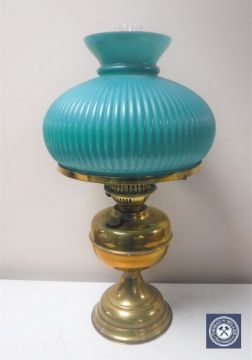 An early 20th century brass oil lamp with chimney and green glass shade