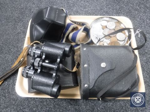 A tray of British coins, crowns, two sets of cased binoculars, together with an Olympus OM10 camera