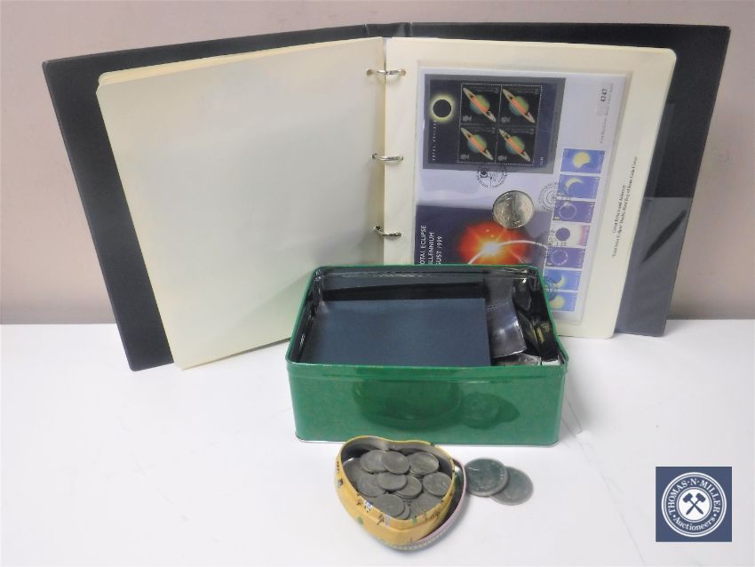 An album of coin first day covers together with a tin of assorted crowns, 1998 United Kingdom proof coin set, tin containing one shilling pieces
