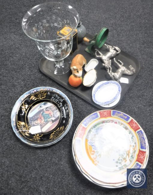 A tray of collectables including Spong No. 2 splicer, pair of horse figures, National Market Traders pot etc, a large etched glass vase and a collection of antique and later plates