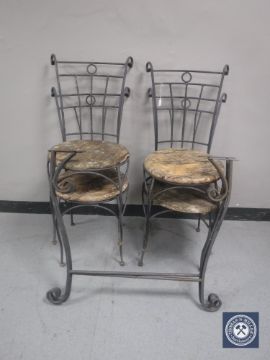 Four wooden seated and metal garden chairs plus a metal garden table frame