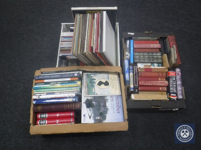Two boxes of books and a box of LP records, CD's and cassettes