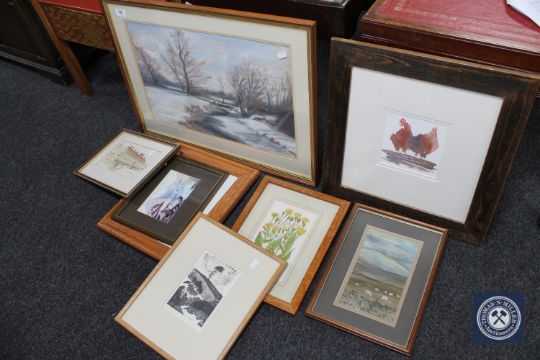 R. Miles, river in a winter landscape, pastel, signed and dated 1986, together with eight other pictures