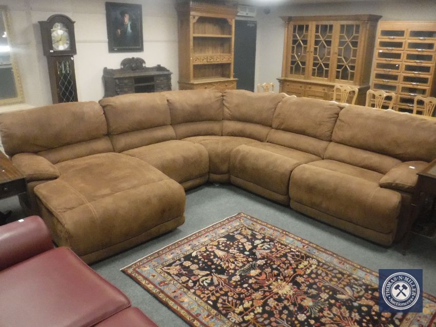 A good quality brown suede L-shaped lounge suite with reclining end (longest length approximately 320 cm).