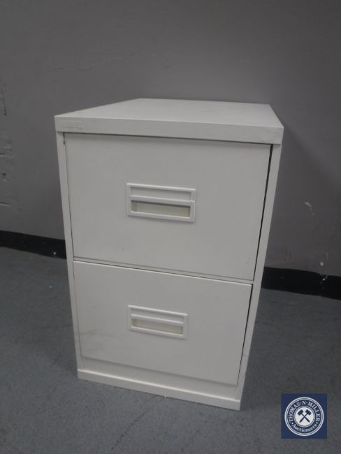 A metal two drawer filing cabinet