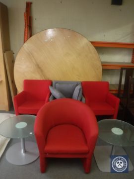 Four reception armchairs, a circular 6' banqueting table top and two circular glass-topped coffee tables (7)
