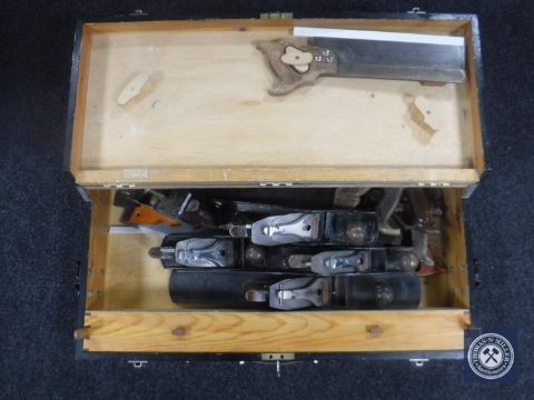 A joiner's tool box of six assorted Stanley planes and hand saws