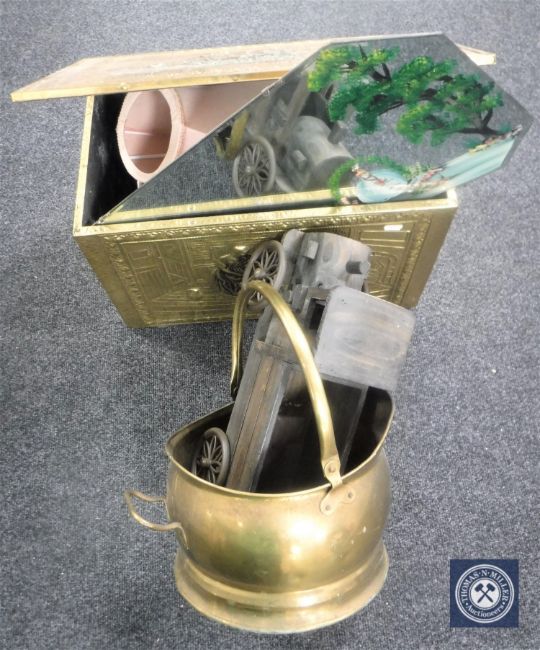 A brass embossed slipper box containing hand-painted mirror, assorted metal ware, brass coal bucket, magazine rack etc