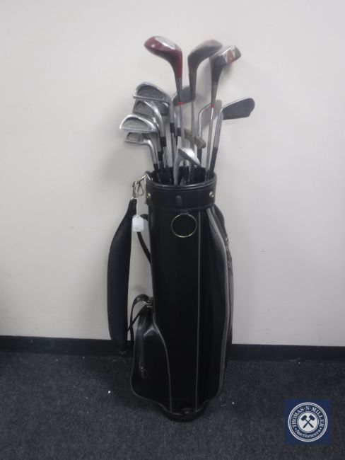 A leather golf bag containing Splalding Diplomat drivers, three irons and a putter