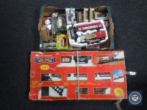 A box of assorted boxed die cast vehicles and a battery operated two in one Super Express train set