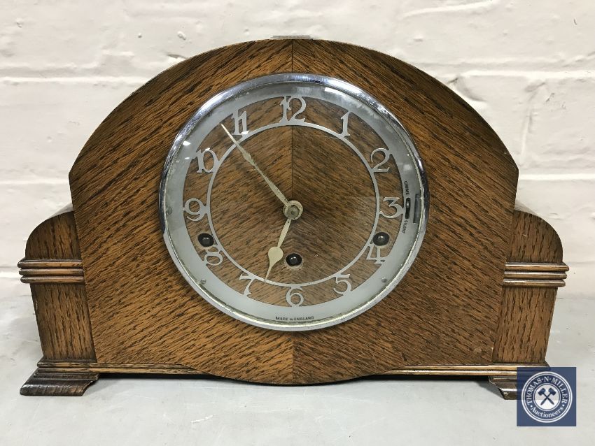An oak cased Garrard mantel clock, Westminster chime, with pendulum and key