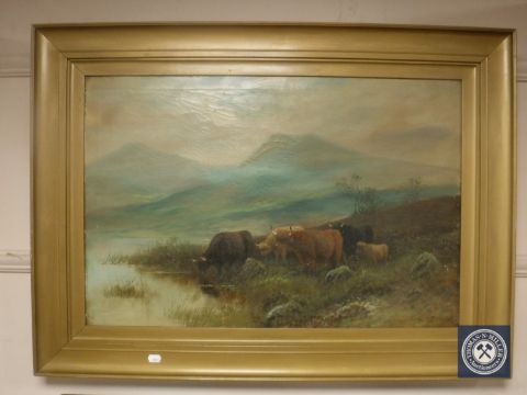 T Wood (19th century) : Highland cattle watering by a loch, oil on canvas, 75 cm x 50 cm, signed, framed.