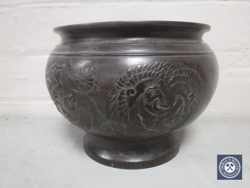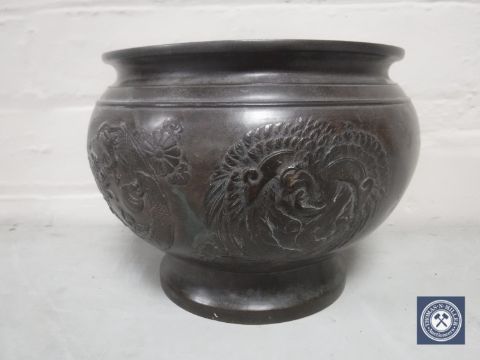 Circa 1900. Several historic shallow dents to the body. The disc-shaped base is loose in the bottom of the planter.