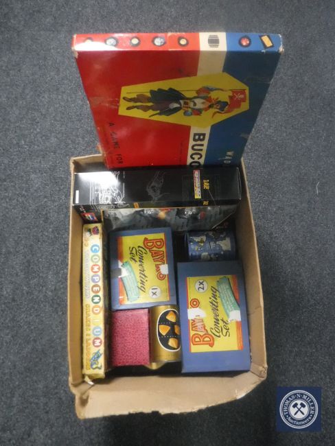 A box of vintage board games, Bayko converting set, BMW motorbikes etc